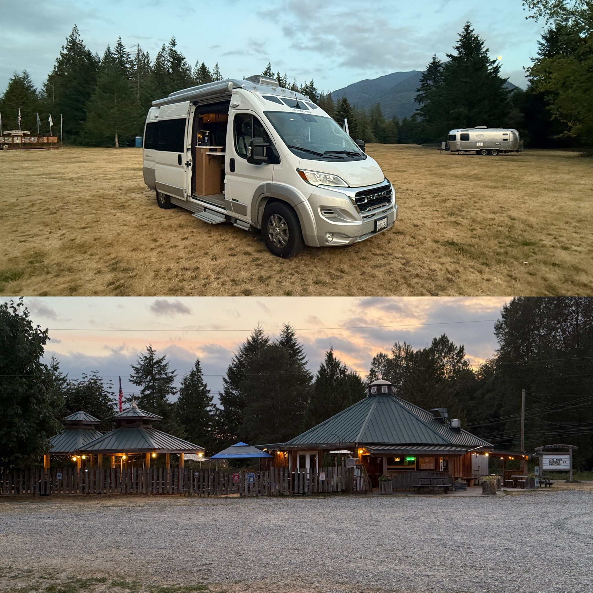 By early evening, we arrived at our next Harvest Hosts spot, a brewery right off Highway 20. We were a little too late to hit the taproom, but we parked in a big open field with plenty of space and fresh air. The sky was overcast, which made for great hiking weather earlier but didn’t offer much of a sunset. Still, it was peaceful and calm, and the perfect way to end a full day.