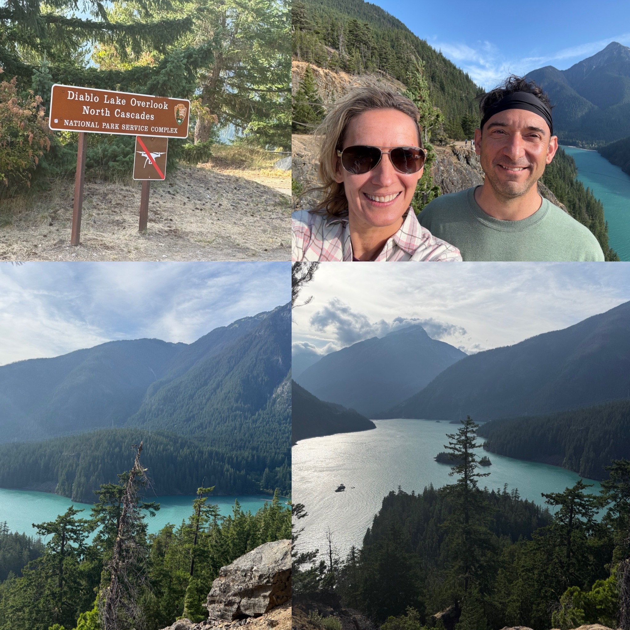After the hike, we continued west across the park along Highway 20, stopping at one of the most breathtaking overlooks of the trip – Diablo Lake Vista Point. It was insanely windy, but the views … OMG – drop dead gorgeous. The turquoise water made us stop in our tracks. Scott wandered right up to the edge (as usual) while I stayed a healthy distance from the guardrails, my legs definitely get a little wobbly with that kind of height.