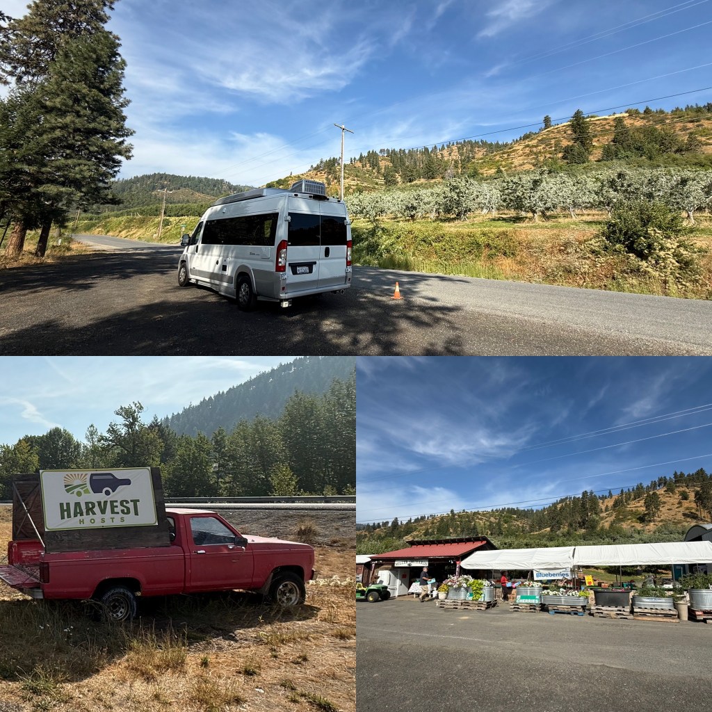 We made our way toward Yakima and stopped at a winery … but not just a winery. This place had it all: wine, whiskey, pie, tomatoes. We picked up a gorgeous tomato salad to go with our dinner, then made our way to our Harvest Hosts stop for the night — an orchard, all to ourselves. It was peaceful, charming, and just perfect.