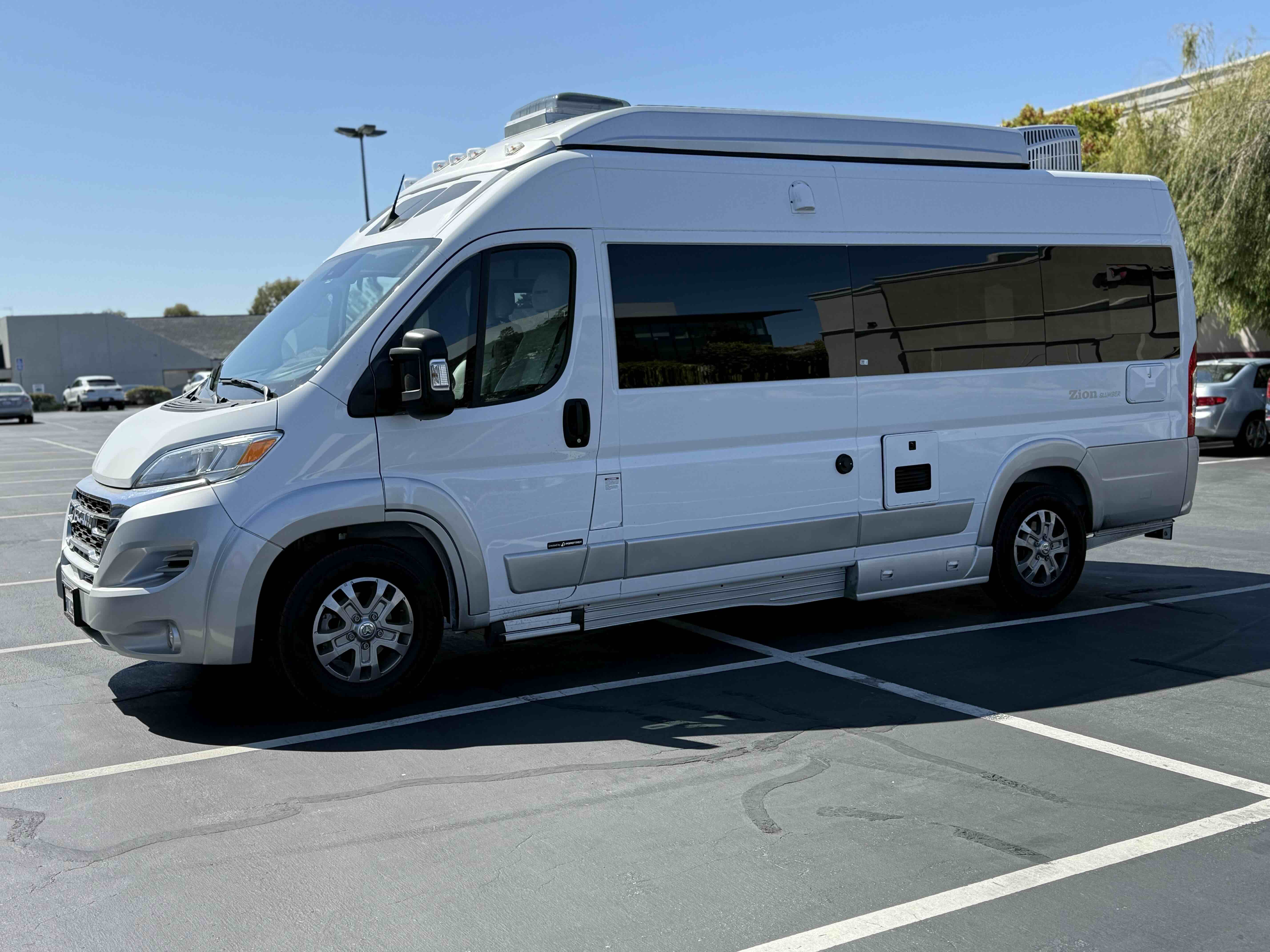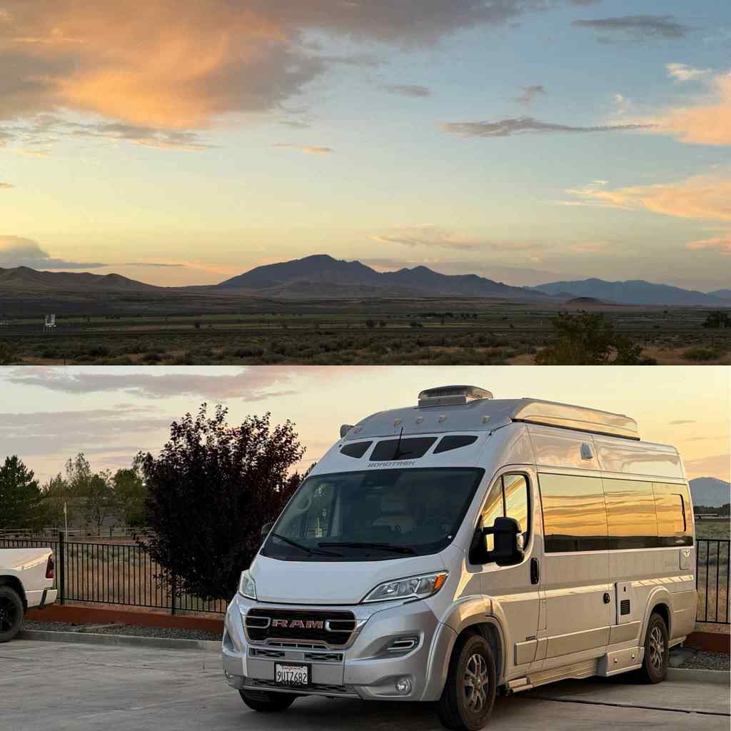 Just before 10pm we rolled into an RV site … Trooper’s (and ours!) very first campground stay. All our previous nights had been Harvest Hosts stops at breweries, orchards, and farm fields. But tonight, Trooper is plugged in like a proper van and we’ve got a few neighbors around.