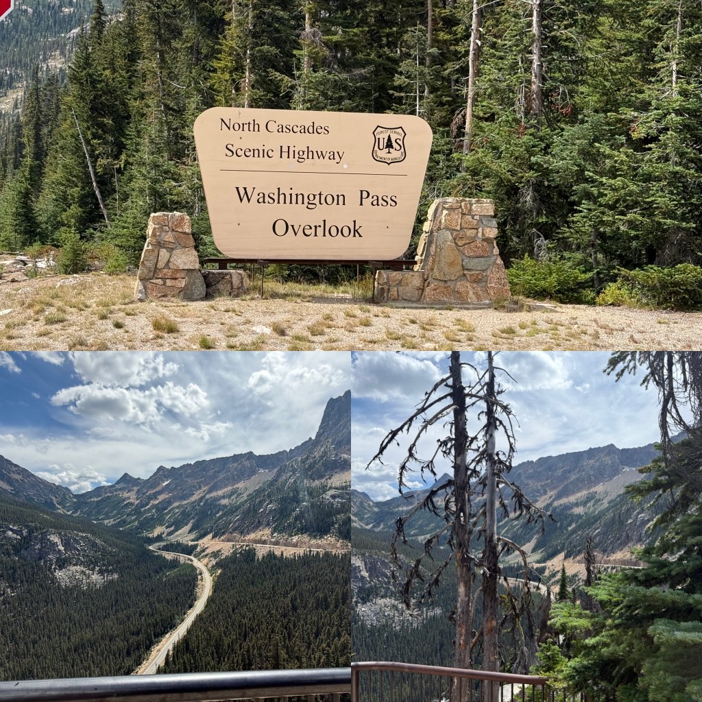 Then came the real adventure. ⛰️ We entered the North Cascades, winding our way through the mountain range, and our first stop was Washington Pass Overlook. And it was an expansive overlook with a long way down!!