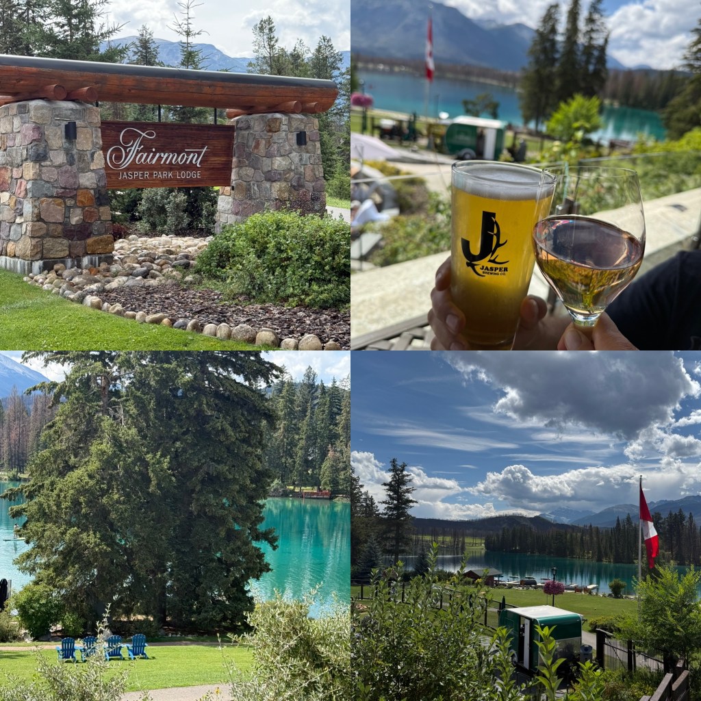 After that, we made our way to Jasper Park Lodge — which, we’re happy to report, was spared during last year’s wildfires. We sat down for a delicious lunch … I had a glass of wine, Scott had a beer… and we soaked up the view. Absolutely breathtaking.